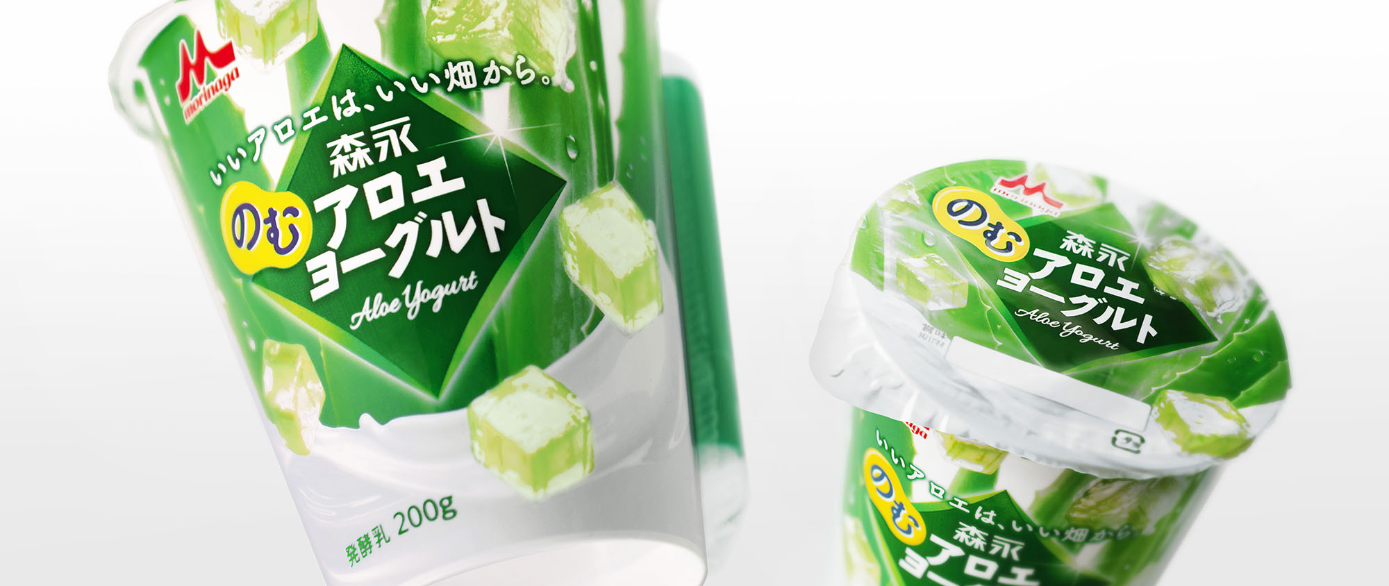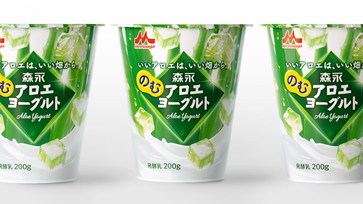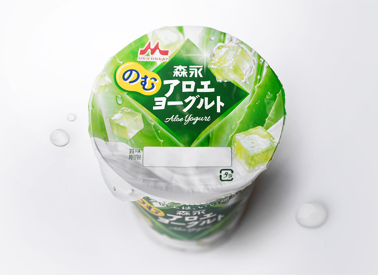 大きなロゴや、みずみずしいアロエの葉と弾ける葉肉でアロエブランドを強調しつつ、なめらかに流れるヨーグルトのビジュアルによって、直感的に飲料であることが伝わるデザインを目指しました。